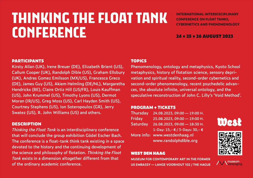 Description: Thinking the Float Tank is an interdisciplinary conference that concluded the group exhibition Gödel, Escher, Bach (May 19 – August 27, 2023) at the contemporary art museum West Den Haag in The Hague, the Netherlands. The artistic exhibition Gödel, Escher, Bach is based on the theme of self-reference, which Douglas Hofstadter’s famous book of the same title highlights. Thinking the Float Tank is a float-tank think tank existing in a space devoted to the history and the continuing development of the science and philosophy of flotation. See pictures of the exhibit here: Gödel, Escher, Bach. Thinking the Float Tank exists in a dimension altogether different from that of the ordinary academic conference.