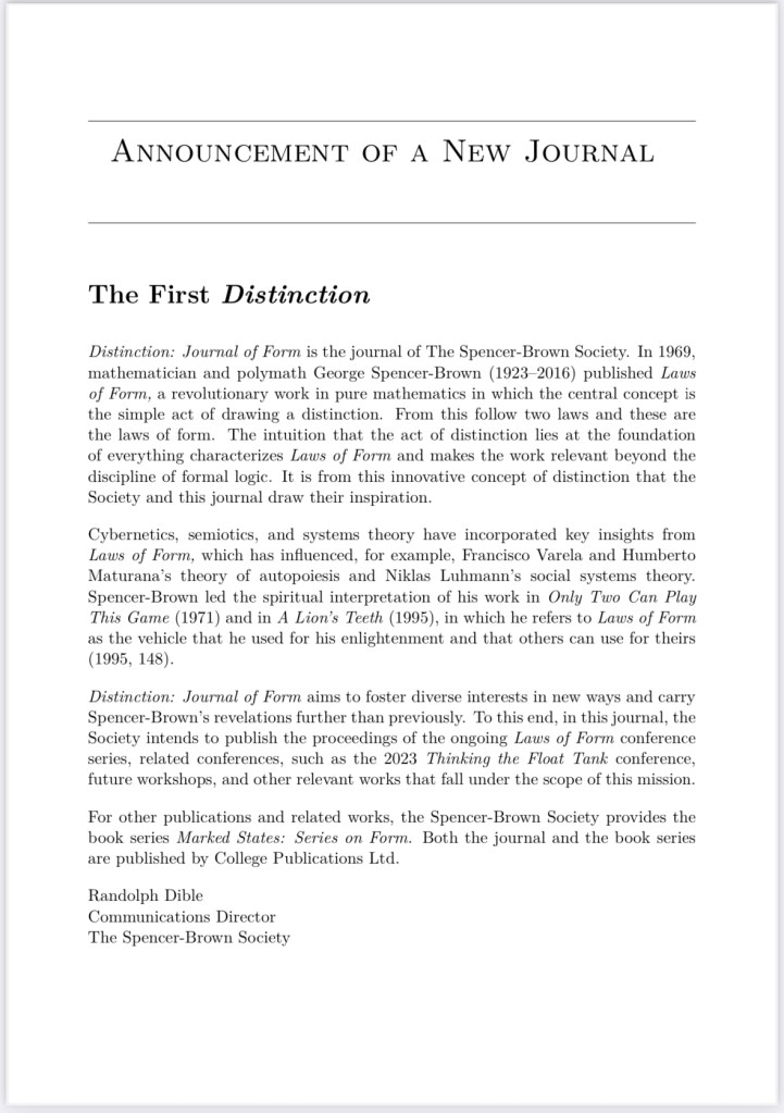 Distinction: Journal of Form is the official journal of the Spencer-Brown Society. It draws inspiration from Laws of Form (1969), the groundbreaking work by mathematician and polymath George Spencer-Brown (1923–2016). At its core is a radical idea: that the act of drawing a distinction is the basis of all form. From this, two laws follow—the laws of form.