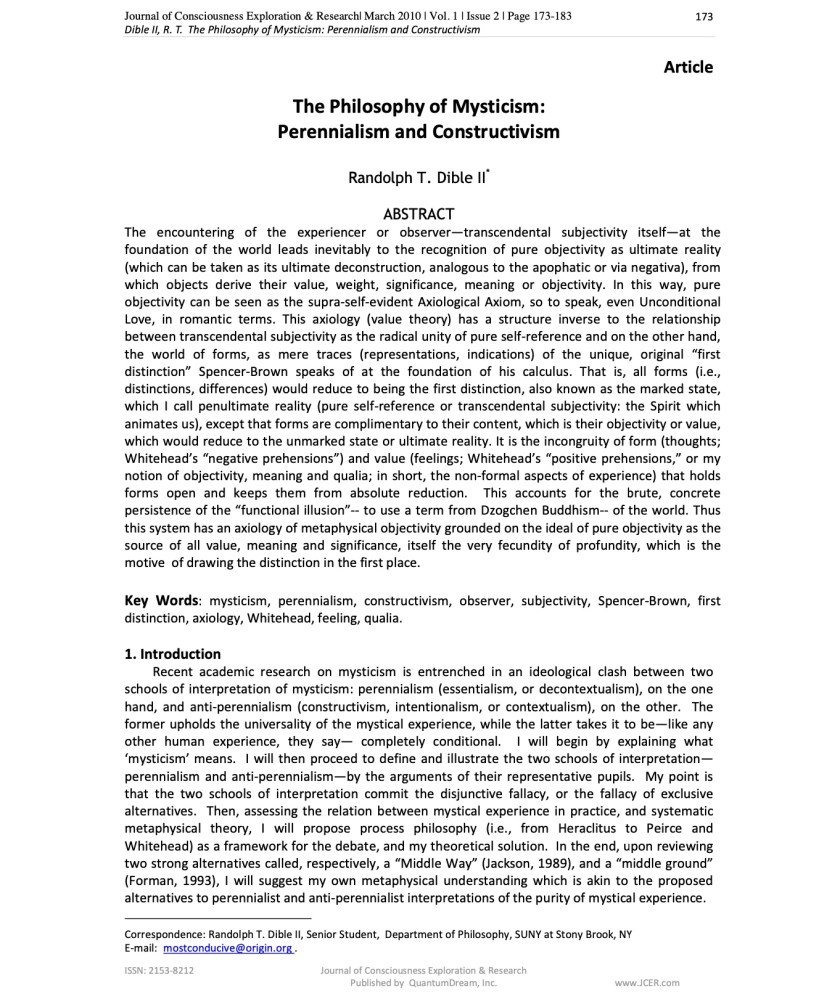 “The Philosophy of Mysticism: Perennialism and Constructivism.” Journal of Consciousness Exploration and Research. Vol. 1.2, pp. 173-183. March 2010