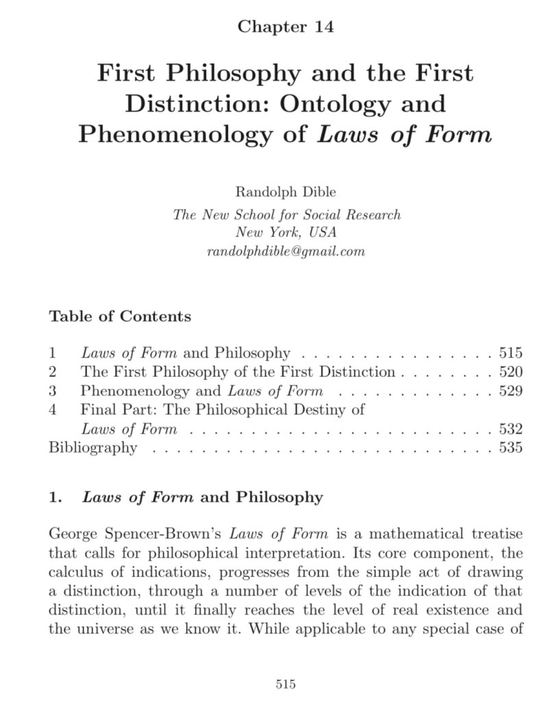 “First Philosophy and the First Distinction: Ontology and Phenomenology of Laws of Form.” Laws of Form—A Fiftieth Anniversary