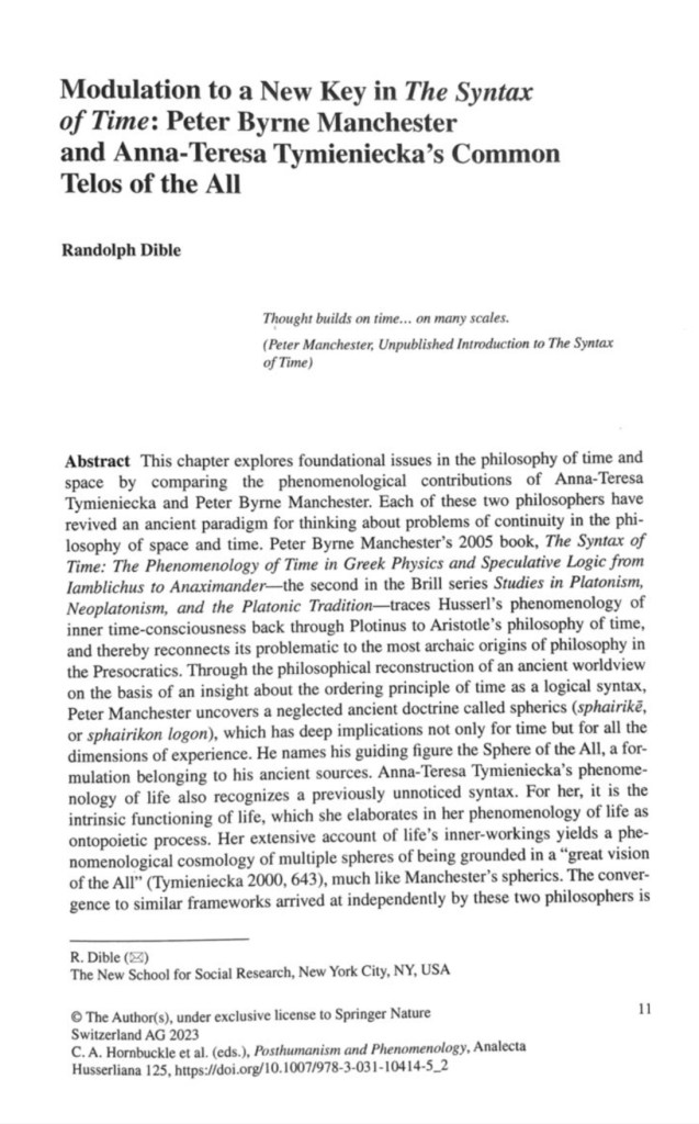 “Modulation to a New Key in The Syntax of Time: Peter Byrne Manchester and Anna-Teresa Tymieniecka’s Common Telos of the All,” Analecta Husserliana
