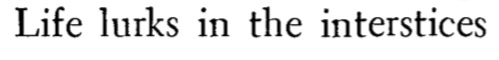 “Thus God’s purpose in the creative advance is the evocation of intensities. The evocation of societies is purely subsidiary to this absolute end. The characteristic of a living society is that a complex structure of inorganic societies is woven together for the production of a non-social nexus characterized by the intense physical experiences of its members. But such an experience is derivate from the complex order of the material animal body, and not from the simple ‘personal order’ of past occasions with analogous experience. There is intense experience without the shackle of reiteration from the past. This is the condition for spontaneity of conceptual reaction. The conclusion to be drawn from this argument is that life is a characteristic of ’empty space’ and not of space ‘occupied’ by any corpuscular society. In a nexus of living occasions, there is a certain social deficiency. Life lurks in the interstices of each living cell, and in the interstices of the brain. In the history of a living society, its more vivid manifestations wander to whatever quarter is receiving from the animal body an enormous variety of physical experience. This experience, if treated inorganically, must be reduced to compatibility by the normal adjustments of mere responsive reception. This means the dismissal of incompatible elements into negative prehensions.”